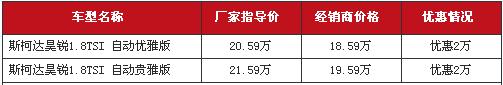 本周,网易汽车编辑在北京地区某斯柯达4S店处了解到,旗下昊锐1.8T部分车型近期出现了整体优惠幅度为2万元的现金让利,货源上店内只有少量库存现车,具体优惠详情详见下表。