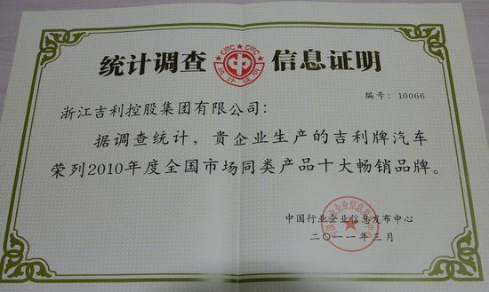 3月20日,第十五届(2010年度)全国市场销量领先品牌信息发布会颁奖典礼在人民大会堂举行,吉利集团获得2010年度汽车行业自主品牌综合实力第一名、2010年度全国市场同类产品十大畅销品牌两项殊荣。全国人大副委员长蒋正华、全国政协副主席王文元等嘉宾出席,到会的还有中共中央政策研究室、国家发改委、商务部、国家工商总局、国家质检总局、国家统计局等领导,以及获奖企业代表、专家学者、数十家全国主流媒体。