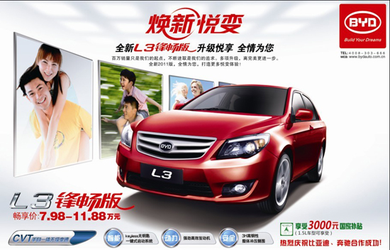 近日,比亚迪汽车发布了最新改款11款L3锋畅版的官方图片,并公布了一些细节消息,据悉目前在终端店面已经开始铺货,面向市场正式销售。L3锋畅四款车型1.8L CVT尊贵型、1.8L CVT旗舰型、1.5L MT尊贵型、1.5L MT旗舰型,价格在7.98万元—11.88万元之间,其中新增的1.5MT旗舰型售价9.98万元,其他车型售价不变。L3锋畅版在配置和品质方面较以往车型有较大的提升。