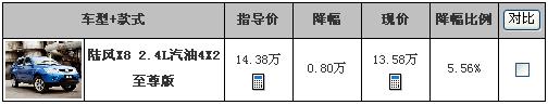 编辑近日从陆风汽车深圳宏创4S店处获悉:目前该店在X8汽油版两驱超豪华车型的基础上推出了2.4L汽油4X2至尊版,这部店内小改款车型的售价为14.38万,客户订购可获赠8000元现金优惠,因此实际售价是13.58万。具体明细请参见下表: