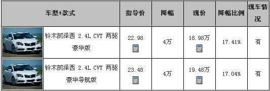 本站编辑从铃木汽车深圳经销商处获悉:由于市场难打开,近期顾客订购凯泽西2.4L前驱车款可以享受4万元的现金优惠,经销商处现车充足且颜色可选。具体明细请参见下表: