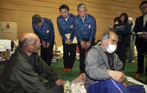 东京电力株式会社副社长鼓纪男22日前往福岛县田村市综合体育馆,向正在这里避难的600多名福岛第一核电站周边居民道歉。自福岛第一核电站发生事故以来,这是东京电力方面首次当面向核电站周边居民致歉。鼓纪男表示,对于本次核事故,“东京电力有责任”。