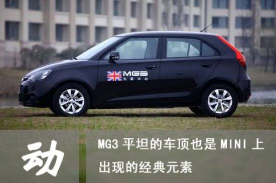 MG3和MINI是曾相识的感觉,很大程度上源自它采用了和MINI一样的黑色镜面效果A柱,另外完全平坦的车顶也是MINI上出现的经典元素。和一款偶像车型拥有类似的造型,对于预算有限又心存向往的年青人来说无疑是种巨大的诱惑。相较于其他小车,有着“英伦传奇精品小车”之称的MG3运用英国车特征元素的手法显得更为成熟老道。