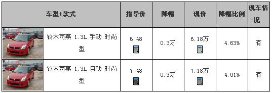日前,搜狐汽车大连站编辑从大连某汽车专营店了解到,2011款铃木雨燕1.3L部分现车,购车享受3000元节能补贴(1.3L超值版除外),另赠送3000元礼包及千元保险。感兴趣的消费者可到店咨询,具体优惠信息如下: