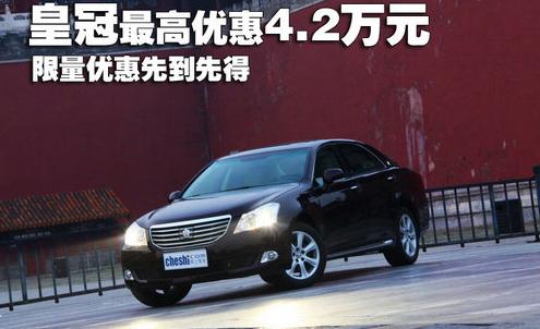 丰田皇冠是一款可以媲美奥迪A6L的高档车,但是在维修保养方面却比豪华品牌要便宜很多,是一款性价比较高的高档车。近日,编者从广州一汽丰田经销商了解到,购买皇冠09款2.5LRoyal 导航版、10款3.0LV6 Royal saloon、10款3.0LV6 Royal saloon尊享版 可现金优惠4万;3.0LV6 Royal saloonVIP版更可现金优惠4.2万,还可享受三年或十万公里免费保修。只限4台,先到先得。