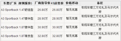 本周,记者在深圳奥德奥迪了解到,目前该店内奥迪A3 Sportback现车充足,颜色丰富,购车让利幅度很大,特别值得一提的是,本月购车还可畅享马尔代夫浪漫之旅,感兴趣的朋友,可与深圳奥德4S店联系询问,详情可见下表: