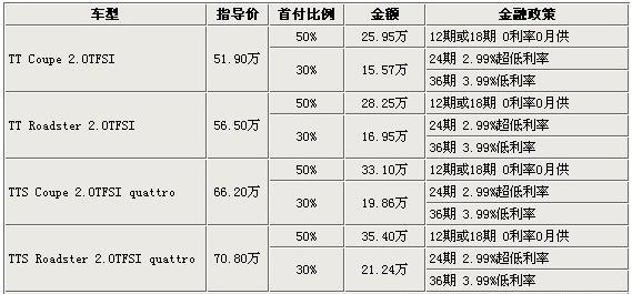 2010年11月27日,2011款奥迪TT系列车型正式在中国大陆地区上市。此次上市的TT车型除了在娱乐系统和外观方面有一定的变化以外,在动力配备上也实现了全面升级。近日,笔者从北京天润奥迪4S店了解到,奥迪TT推出两种分期购车特惠方案,最低首付30%,便可轻松将奥迪TT轻松“贷”回家。具体请见下表: