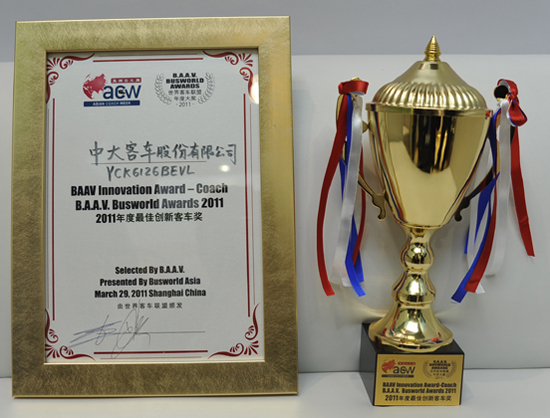 3月30日,以“新舞台、新价值、新发展”为主题的2011(第十一届)世界客车博览亚洲展览会(Busworld Asia 2011)在上海汽车会展中心隆重拉开序幕。此次展会,中大汽车携YCK6126BEVL、YCK6128BEVC、YCK6129HGD、YCK6128HGN四款车型盛装亮相,受到与会专家和业内人士的广泛赞誉。 中大YCK6126BEVL荣获2010年度最佳创新客车奖。