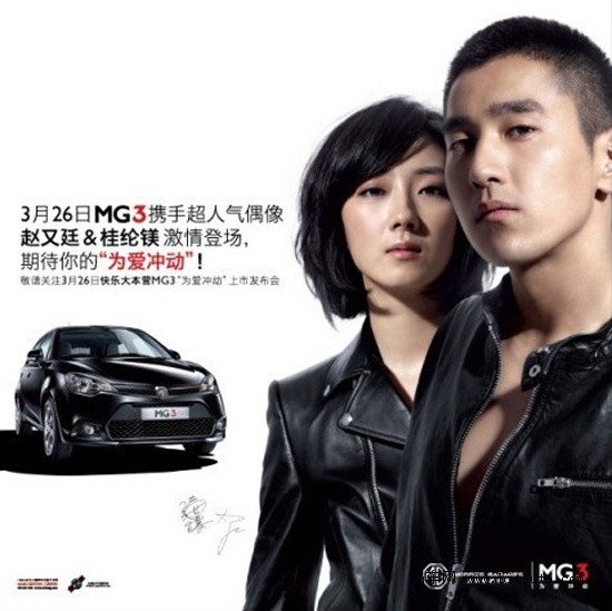 一个是依靠《艋舺》斩获台湾金马奖影帝的新生代人气天王,一个是以清新优雅的健康形象,大受热捧的气质天后,当赵又廷邂逅桂纶镁,将会有着怎么样的唯美故事呢?在《快乐大本营》节目中间,一部以“为爱冲动”为主题的微电影亮相荧屏:为了与赵又廷“偶遇”,小镁冲动的制造一次又一次的“意外”,正如广告语中所说,“每天期待一点点,每天靠近一点点,发现你的不同”,在都市绚烂的霓虹下,两个人最终也有了浪漫的结局。在这其中,赵又廷驾驶的黑色MG3与小镁驾驶的白色MG3成了不可或缺的“第三者”,使得画面更加唯美浪漫,因MG3结缘,因MG3而冲动,因MG3而有爱。