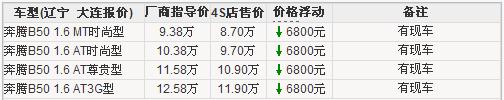 一汽奔腾B50是奔腾旗下的第二款车型,更侧重于家庭用车,因为奔腾B50是在马自达6的平台基础之上缩短轴距,由Italdesign对内外饰造型进行重新开发而来,是一款性价比很高的车型,近日,网上车市编辑从大连地区一汽奔腾4S店了解得知,奔腾B50店内有部分车型现车出售,购车现金优惠6800元,详情请见下表: