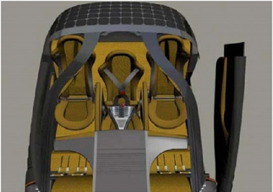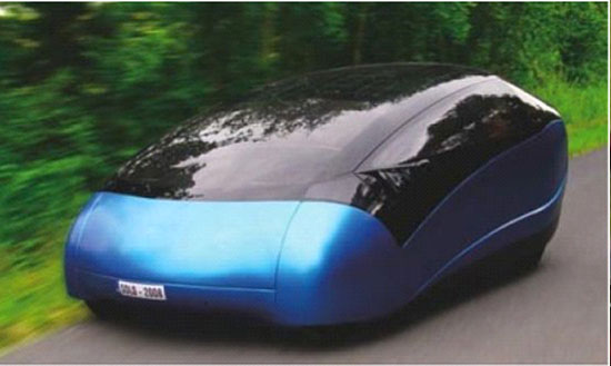 这个看上去有点象科幻电影里才能见到的车是由匈牙利人设计的,叫“Antro Solo”。这辆的动力系统非常特殊,有三种动力来源,一是太阳能,整个车顶就是一个太阳能电池板,在25公里以内的距离,只靠太阳能就可以行驶;而是混合动力引擎,燃料可采用汽油,又可采用乙醇,适合长距离行驶;三是人力,很多人会感到奇怪,难道说这辆汽车还可以骑着走?这辆车可以乘坐三个人,每一位乘客面前有一对踏板可用于人力发电,从而有助于使车子仅保持电动驱动模式。一旦人力驾驶疲倦,或者独自驾驶时,引擎就会开始发挥功能。