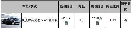 编辑近日从上海通用深圳安骅别克4S店处获悉:目前顾客在该店订购林荫大道3.0 豪华版车款,可在包牌价的基础上享受最高3万元的现金优惠(包牌价=车身价+购置税+上牌费)。具体明细请参见下表: