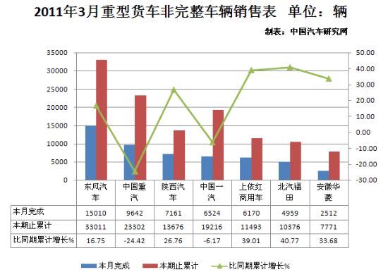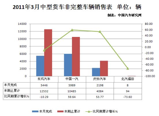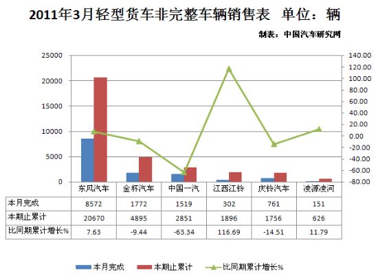 2011年3月货车非完整车辆生产71765 辆,累计生产196724 辆,销售81424 辆,累计销售187020辆,同比累计增长分别为3.28 %和3.87 %。