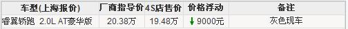睿翼轿跑车拥有四大领先优势:独具魅力的跑车化外型与内饰、先进的车身轻量化技术、顶尖的运动性能与安全性能,以及越级配置带来的高品质享受。近日了解到睿翼轿跑灰色现车1辆 现金优惠9000元。详细价格请参照下表: