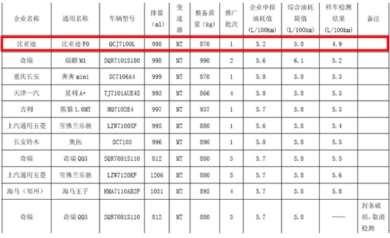 日前,工业和信息化部、发展改革委员会、财政部三部委联合组织对入选“节能惠民目录”的车型进行第一次抽样核查工作。据悉,此次核查工作组根据节能汽车推广目录发布的车型数量、推广车型销量及抽样现场可供抽样车型等情况,对31 家企业的64 款车型样车进行燃料消耗量核查,其中比亚迪汽车旗下的F0实测的结果成绩优异,油耗大大低于公司申报的油耗限值,以百公里4.9L的检测结果领跑同级别车型,微型车“节油王”的称号名不虚传!