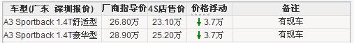 奥迪A3是一款奥迪进口车型,与宝马1系和奔驰B级车型的定位相似,同样是豪华品牌入门级车型,将运动性能和高端车的舒适性进行了很好的结合。近日,编辑由深圳奥迪4S店获悉,时值五一临近,该公司推出提前放“价”让利优惠,购奥迪A3 1.4T豪华型可获得现金优惠3.7万元,展厅内有现车销售,同期购买奥迪A3各款车型也有不同幅度现金优惠,具体到店面议,更详细情况可咨询0755-33002601.