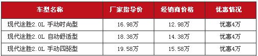 近日,编辑在北京亚运村汽车交易市场某二级现代经销商处获悉,店内09款途胜部分高配车型近期出现了整体让利为4万元的现金优惠,货源上店内现车较多,具体优惠详情详见下表。