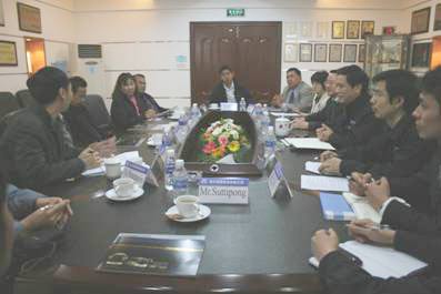 总经理罗邦初(右三)陪同外国客人来厂考察和座谈