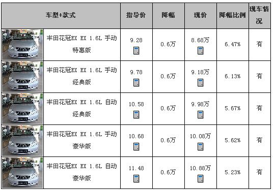 编辑近日从一汽丰田深圳经销商处获悉:目前顾客订购花冠EX全系车款,可享受全系6000元优惠,不过现车不多,顾客需提前预订。具体明细请参见下表:
