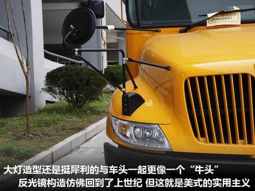 美国人实用主义精神有被发扬出来,但是即为校车那些太过花哨的东西完全没有必要,大灯的造型修长,主要用来修饰略显愚蠢的车头,上方校车的英文单词,让人一看去而不是一辆大公交。