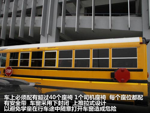 信号更清晰 采用醒目的黄漆和反光板,配备停车信号臂,孩子上下车时像交通信号灯一样闪烁,装有下车护栏。校车是完全按照美式校车标准来制造的,不论是外型抑或性能,都以安全为第一要素。在美国,校车的安全系数是家庭轿车和公共汽车的40倍。