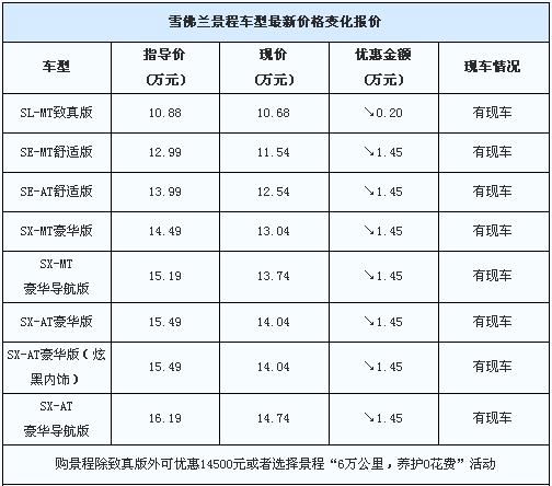 编辑近日在湖南华洋世纪汽车销售服务有限公司获悉,购买雪佛兰景程除致真版外的全系现车均可现金优惠14500元或者选择景程“6万公里,养护0花费”活动,景程致真版限时抢购价106800元,店内有现车,详情可见下表: