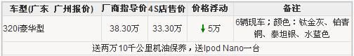 近日,编者从广州粤宝汽车销售服务有限公司了解到,4月23日店内将举行购车优惠活动,购买宝马320i豪华型优惠超5万元。据悉本次优惠仅限一天,除了能获得超值现金优惠之外,还可获赠丰富购车礼包。具体优惠见下表: