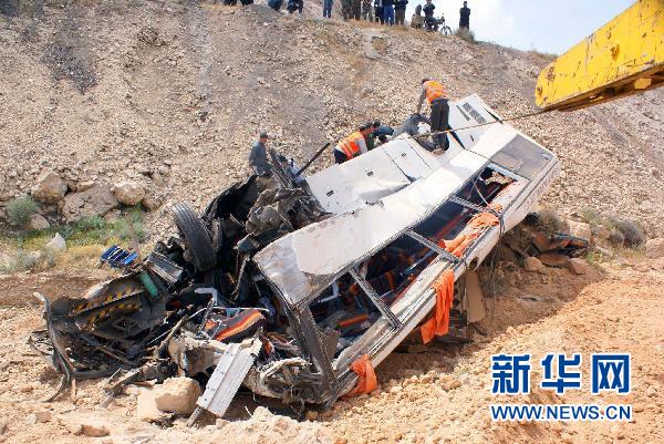 这张阿拉伯叙利亚通讯社4月21日提供的照片显示,在叙利亚大马士革和霍姆斯之间的一处山谷,救援人员在交通事故现场工作。当日,这辆公交车撞上两辆卡车后坠入山谷,车上25名伊拉克人死亡,另有20人受伤。新华社/法新
