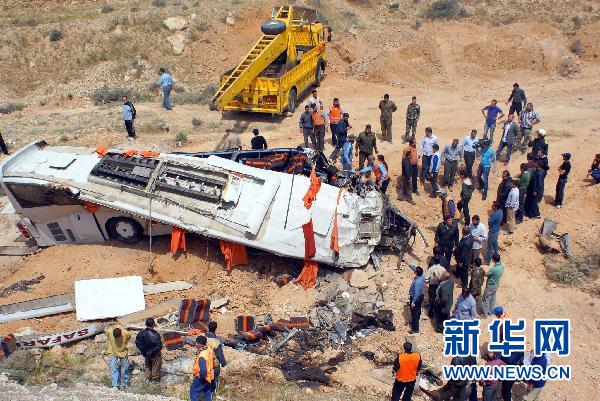 这张阿拉伯叙利亚通讯社4月21日提供的照片显示,在叙利亚大马士革和霍姆斯之间的一处山谷,救援人员在交通事故现场工作。当日,这辆公交车撞上两辆卡车后坠入山谷,车上25名伊拉克人死亡,另有20人受伤。