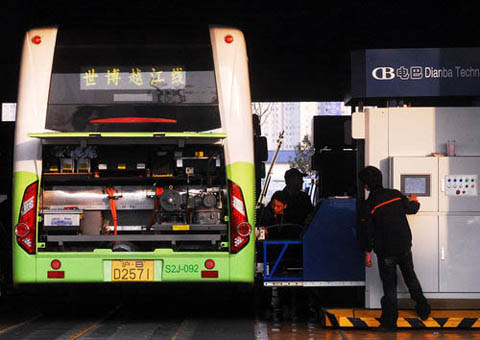 2010年4月5日,上海,工人调试行驶在世博园区的纯电动公交车