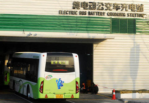 2010年4月5日,上海,纯电动公交车驶入世博园区车站