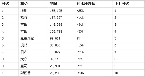 美国本田汽车生产商通用公司和福特公司继续占据销量榜前二,销量分别为185,105辆及157,327辆,但同比同样显著下滑,跌幅分别为25%及14%。