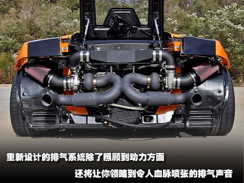 说到这套双涡轮改装套件的具体内容,Underground Racing思考的十分完善。一套尺寸客观的改装涡轮是必不可少的。TiAL出品的高质量泄压阀能够有效地控制好涡轮增压系统的增压值。在进气方面,Underground Racing自行设计了一套更加合理的进气管路并且采用了飞机发动机过滤芯同样材质的高流量空滤来保证发动机进气方面的顺畅性。当然,为了保证进入发动机的空气的质量,这套改装套间里还包括有一套中央冷却系统来提升进气空气的密度,达到充分燃烧的目的。超跑的魅力和乐趣不仅仅是炫耀和速度,每当转速提高的时候,动听的排气声音也是不可或缺的元素之一。