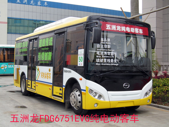 第26届大运会于8月12日在深圳举行,作为国内新能源客车领军企业、2011年第一季度新能源客车销售冠军、全球最大的新能源客车生产企业--深圳市五洲龙汽车有限公司将会提供2000多辆新能源客车在深圳公交系统运营。在这2000多辆新能源汽车中,就有部分用于支线客运的FDG6751EVG型纯电动城市客车。FDG6751EVG销售价格为100多万元,是全球最小的纯电动城市客车,也是最具技术含量的新能源中型城市客车。FDG6751EVG总长7495 mm,车身宽2340 mm,轴距4800mm,最大座位数可达30人,最高车速80 km/h,搭载上海大郡DJ-2103-1-T-100-630-035-W-A0电动机,额定功率和峰值分别为48KW、100KW,并采用磷酸铁锂动力电池,总电压和总容量分别为336V、300Ah。前后桥采用东风德纳大承载力精磨桥,装配6气囊空气悬架。