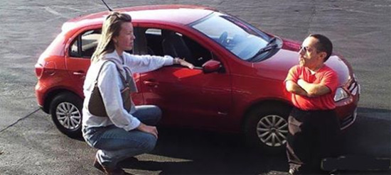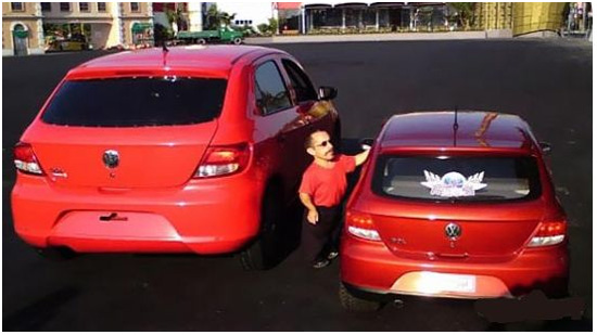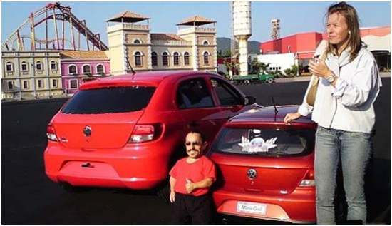 德国大众汽车公司近日在巴西汽车展上展出了一款迷你高尔(Mini-Gol)汽车,只有原车30% 大小,长2.25。不过麻雀虽小,五脏俱全,仪表盘、座椅、内饰都和原车一样,只是只有1米5以下的人才可能进入车内驾驶它。该迷你汽车装载了5.5hp 引擎,最高时速27公里,全世界只有2辆。为了配合小车子的展出,他们还找到一个巴西小矮人来试驾。