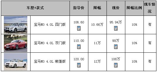编辑近日从宝马汽车深圳经销商处获悉:目前该店针对进口宝马M3全系车款展开促销让利活动,顾客购车最高可以享受12万元的现金优惠,感兴趣的朋友不妨到店咨询。具体明细请参见下表: