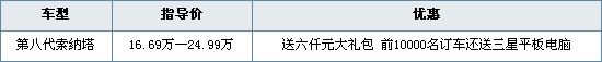 近日,编辑从北京现代外汽荣现销售服务有限公司了解到,现在购买第八代索纳塔,送六仟元大礼包,前10000名订车还送三星平板电脑,感兴趣的消费者可以到店看车并了解情况。详见下表: