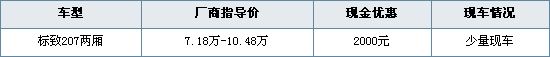 近日编辑从杭州东风标致物产森美4S店处了解到,现在购买标致207,现金优惠2000元,标致1.6L及以下排量车型的客户可享受国家3000元/台节能惠民补贴。另外,东风标致全系本月推出“极限利率,超低首付,贷动从容生活”信贷专案:享国家公积金贷款利率 + 20% 首付。具体降价明细如下表: