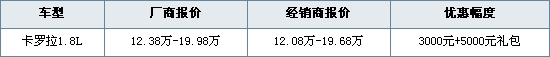 受日本地震影响全国各处丰田各车型的价格都有所收紧优惠已经难得一见,近日编辑从广州庆丰丰田处获悉,即日起到店订购卡罗拉1.8L任意一款车型,享受补贴3000元现金再送5000礼包,已属难得,感兴趣的朋友可致电或到店详询,具体情况如下表: