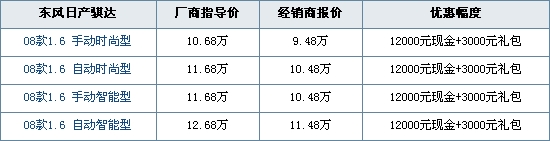 日前,编辑从沪上东风日产4S店了解到,老款骐达目前优惠现金12000元。除此以外,购车再赠价值3000元的精品礼包,有兴趣的网友可以到店详谈。具体优惠明细如下: