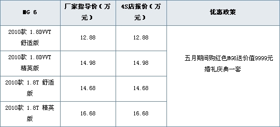 近日,编辑从上汽MG天津路顺4S店了解到,五月期间购MG6红色车型送价值9999元婚礼庆典一套,具体详情请见下表: