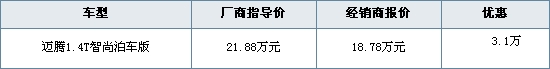 近日编辑从一汽-大众北京4S经销商北方华驿了解到,本周末店内迈腾推出智尚泊车版优惠活动,该车型是在1.4TSI基础上加装了“智能泊车辅助系统”,并对电脑系统进行了升级,极大地提高了该车驾驶性与舒适性,优惠幅度为3.1万元,感兴趣的朋友可以咨询经销商。详情如下:
