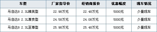 近日,从广州一汽马自达经销商博程4S店处了解到,目前该店还有部份马自达8现车,现购买马自达8可优惠现金5000元。另外,新一代大型MPV-马自达8最新推出“半价提车、零利息、零月供”优惠政策,店内部分颜色有现车,关注马8的网友可咨询广州博程4S店了解详情。