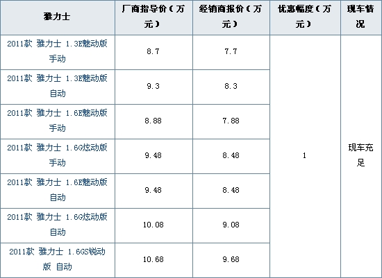 近日,编辑从广汽丰田汇丰行河西店获悉,5月份,店内2011款雅力士优惠幅度全面增加,全系优惠1万元,现车齐全,颜色丰富,详细情况如下表: