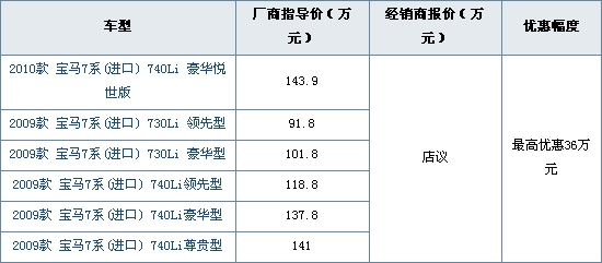 近日,编辑从天津中顺津宝4S店获悉,5月份,来店内购买BMW7系,可以获得最高36万元的超值优惠,店内部分现车供应,感兴趣的朋友可以到店咨询销售顾问,具体价格详情如下表: