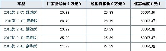 新君越是一款符合国内消费者需求的高级轿车,无论从外观还是内饰都给人一种奢华感,内部空间很宽敞。近日,编者从别克北京经销商处获悉,新君越有少量现车,购车可获赠8000元礼包。详情请见下表: