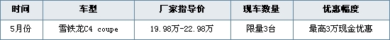 近日编辑从浙江富通汽车有限公司了解到,5月期间到店购买雪铁龙C4 Coupe,最高可享3万元现金优惠。该款车型店内限量3台且颜色充裕。此外,凡外地来杭州购车的车主,均可报销车旅费,再送杭州一日游。购车热线:400-696-1808,0571-85382818。详情见下表: