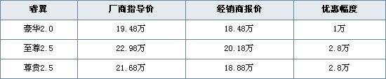 价格波动原因:睿翼一直以来都有万元以上的优惠幅度,2011年购置税政策已经停止,目前2.0排量优惠1万元,2.5排量优惠2.8万元,降幅又回到了去年金九银十时。