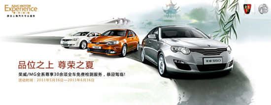 值得一体的是,2011尊荣体验夏季免检服务已全面启动。上海汽车“尊荣体验”以安全消夏为己任,提供空调系统、发动机、底盘等共30余项全车免费检测服务,更以专业精诚的态度为您悉心调校保养,让爱车度暑之际也能畅行无阻,愈是夏意正盛,愈显惬意尊荣。