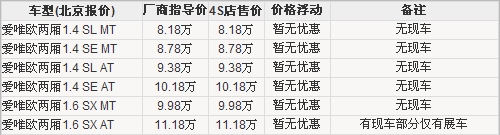 爱唯欧是通用雪佛兰的全新车型,近日根据网上车市价格监测系统显示,目前全系车型仅有1.6两厢有少量现车,颜色以银色,黑色,橙色为主,内饰为黑内,1.4车型暂时无车,具体售价如下: